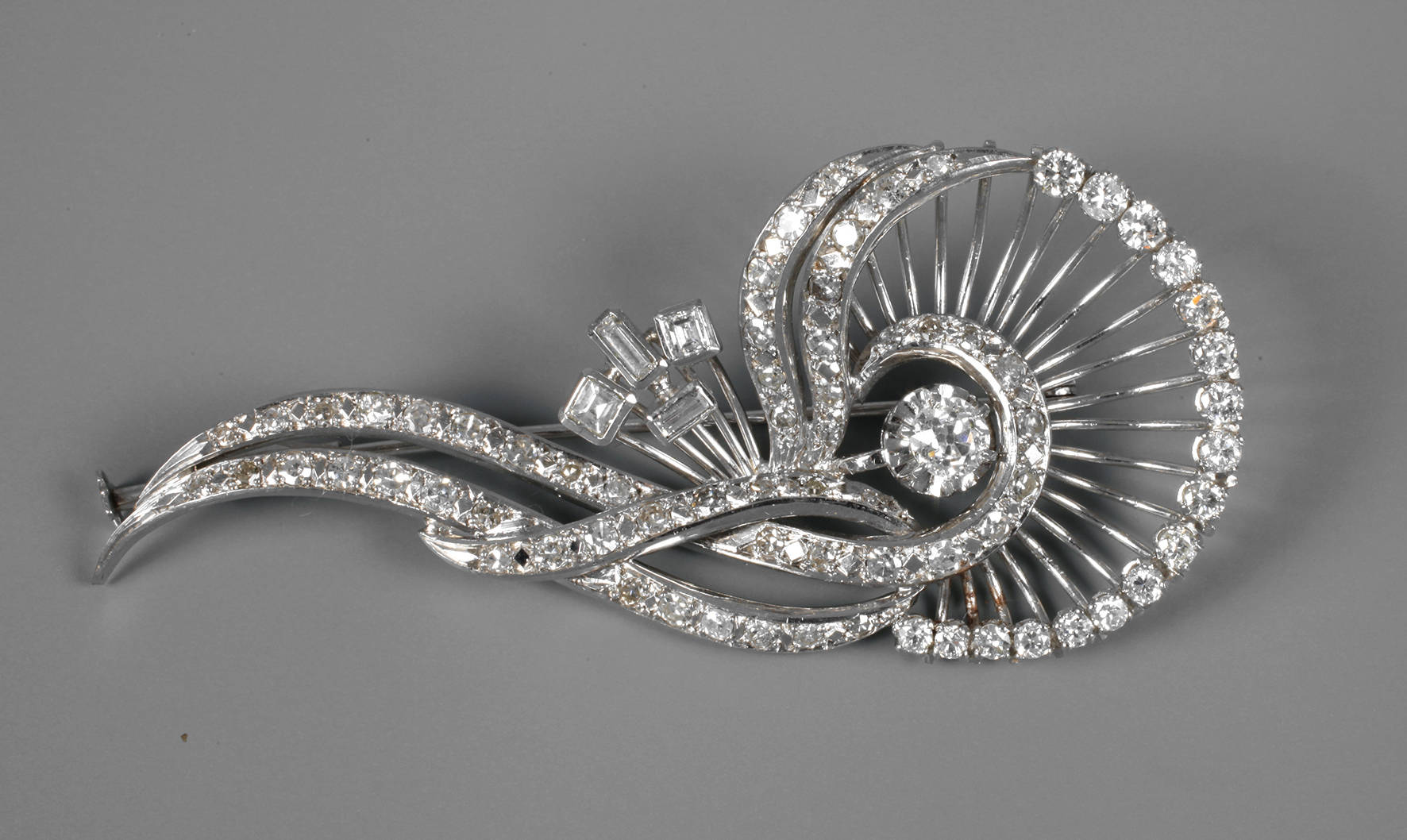 2. Hälfte 20. Jh., hochwertige Brosche, besetzt mit hochwertigen Brillanten und Diamanten, teilweise in Baguette- und Carréeschliff, der mittig größte Altschliffbrillant ca. 0,25 ct, alles in gutem Weiß ohne sichtbare Einschlüsse, die Bänder mit rautenförmigen Verzierungen, L 7,5 cm, G ca. 17,9 g.
