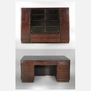 1930er Jahre, deutsch, gemarkt Deutsche WK Möbel, bestehend aus Schreibtisch und passendem Bücherschrank, Makassar-Ebenholz furniert, Schreibtisch mit abgerundeten Ecken, frei im Raum stellbar, die Rückseite mit Bücherregalen, der Bücherschrank komplett zerlegbar, mit großzügig verglastem Mittelteil, normale Alters- und Gebrauchsspuren, gering rest.bed, Maße Schreibtisch H 77 cm x B 186 cm x T 79 cm, Maße Schrank H 175 cm x B 248 cm x T 43 cm.