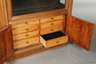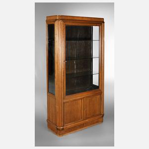 wohl Frankreich, 1920er Jahre, Ladenvitrine aus massiver Eiche, mit facettgeschliffenen Scheiben und Glaseinlegeböden, hinter den zwei Türen acht mit schwarzem Filz ausgekleidete Schubläden, original Schlüssel, H 188 cm x B 104 cm x T 38 cm.