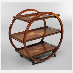 um 1930, am Boden Klebeetikett Thonet, Mahagoni furniert, kreisrundes Gestell, drei Platten tragend, diese mit eingelegtem Rautenmotiv, restauriert, H 81 cm x B 77 cm x T 45 cm.