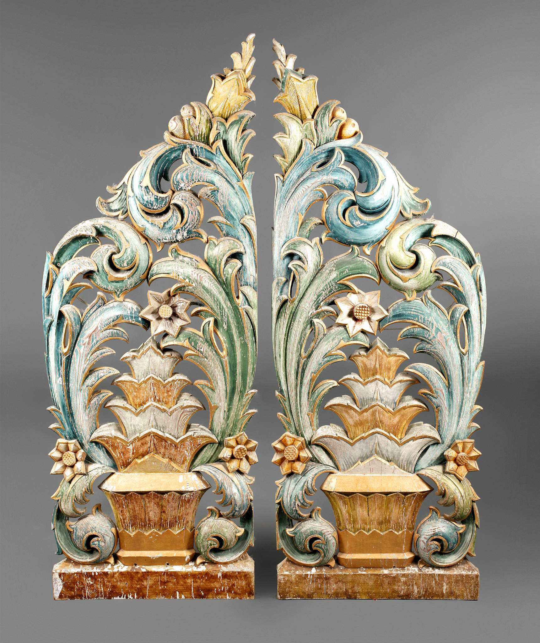 deutsch, um 1925, nach Angaben des Einlieferers aus einem Sarottigeschäft, Nadelholz geschnitzt, farbig gefasst, partiell vergoldet, Gegenstücke mit durchbrochen gearbeitetem, stilisiertem Floraldekor, unrestaurierter Originalzustand, Farbverluste, H je 150 cm x B je 55 cm.
