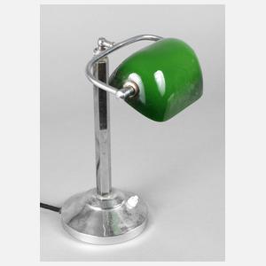 1920er Jahre, Messing verchromt, Rundfuß mit polygonal facettiertem Lampenschaft, an Kugelgelenk variabel arretierbarer Lampenschirm, dieser pass. ergänzt, Elektrik erneuert, H 30 cm.
