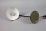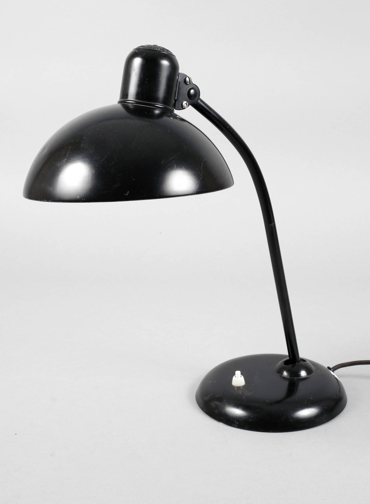 um 1930, Schirm gemarkt Original Kaiser Idell, beschwerter Rundfuß mit an Kugelgelenk neigbarem, leicht geschwungenem Leuchterarm sowie variabel arretierbarem Halbkugelschirm aus schwarz gefasstem Weißblech, Elektrik erneuert, Schirm min. gedellt, H max. 57 cm.