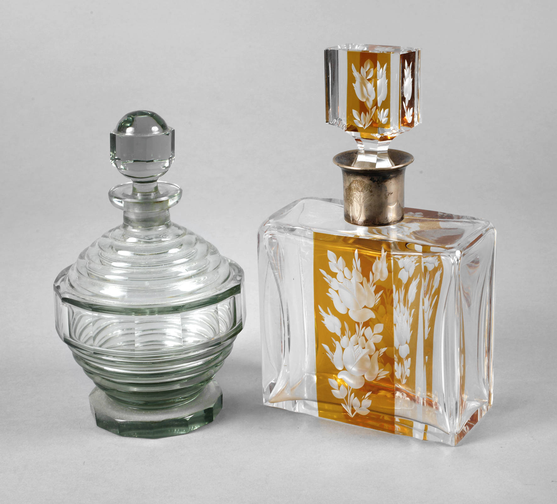 1930er Jahre, klares und hellgrünes Glas mit Facettschliff, einer gelb gebeizt mit Mattschliff, dieser mit Silbermontierung gestempelt 800, Herstellermarke Theodor Müller Weimar, Gravur ”1. Januar 1914 bis 1939 M.G.”, H 21 cm und 22 cm.