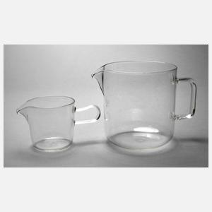 Entwurf 1931 für die Jenaer Glaswerke Schott & Gen., Saucer mit Fünfeckmarke und Schriftzug ”Jenaer Glas Soser”, Milchtopf mit Firmenmarke Schott & Gen. und Bezeichnung 1 L, klares feuerfestes Glas, Deckel des Milchtopfs und Untersatz des Saucers fehlen, H 8 cm und 13,5 cm. Quelle: Torsten Bröhan, Glaskunst der Moderne, S. 434, Nr. 209 und S. 438, Nr. 211.