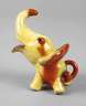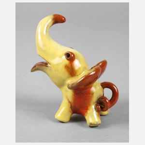 1930er Jahre, ungemarkt, roter Scherben, gelb und Korallrot glasiert, als stilisierter Elefant mit Ringelschwanz, L 10 cm.