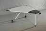 Entwurf 1981, auf Gestell gemarkt ORDO sowie Herstelleretikett HAWORTH, runder Tisch bestehend aus acht Elementen, unterschiedlich kombinierbar und höhenverstellbar, je zwei Beine mit Rollen, grau lackiertes Metallgestell mit Plastikfüßen, Platte aus grau laminiertem Pressspan, im Zentrum schwarz abgesetzt, Alters- und Gebrauchsspuren, Ecke eines Segments fehlt, H 70-75 cm, D 360 cm. Jean-Louis Berthet geboren 1959 à Clermont-Ferrand zählt zu den besten französischen Designern der Gegenwart. Er gewann u.a. folgende Preise: Best Furniture of I.D. Annual, Design Review 98. AFEX Award 1997. ID. Annual Design Review 1997. Best of NEOCON 1997. Chicago. AWARDS Association of Registered Designers of Ontario (ARIDO). Trophée Collectivités locales 94. Trophée de La Dalle d’Or 92. Hollande. Grand Prix du Design 1990.