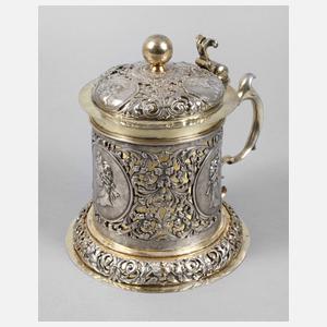 Meistermarke von Adolf Gaap, Meister ab 1664, stirbt 1695, Beschaupunzen um 1685–89, am Boden Tremolierstrich, der Korpus aus vergoldetem Silber, die gesamte Ornamentik als Applikation aufgelegt, diese aus Rollwerk mit Blättern und Trauben, sechs römische Herrscherportraits auf punziertem Fond, gegenläufiger C- Henkel, den Scharnierdeckel haltend, großer Kugelknauf über Palmetten, seltenes Stück in sehr guter Erhaltung, H 23,5 cm, G ca. 1.770 g. Quelle: Helmut Seling, Die Kunst der Augsburger Goldschmiede 1529 bis 1868, Band III, Nr. 1653.