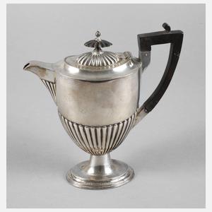 19. Jh., gestempelt Walker & Hall Sheffield England sowie Nummer 53 149 76, ovale Kanne, partiell gerippt, Henkel und Knauf aus Holz geschnitzt und geschwärzt, rückseitig scharnierter Klappdeckel, etwas gedellt, H 19,5 cm, G ca. 334 g.