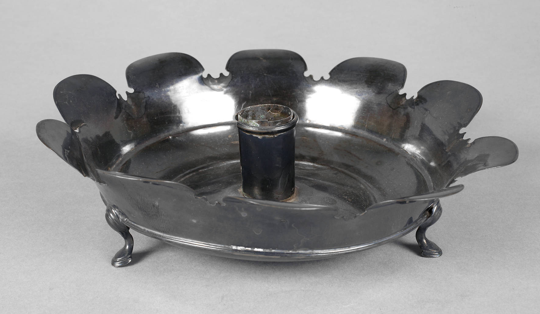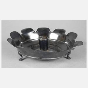 1. Hälfte 19. Jh., verschiedene Silbermarken und ein Tremolierstrich, weite Tropfschale auf drei angedeuteten Füßchen mit geschweiftem Rand, schraubbare Tülle, etwas eingerissen mit Gebrauchsspuren, D 18 cm, G ca. 203 g.
