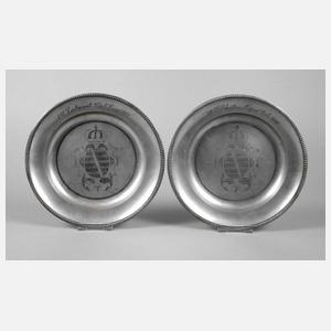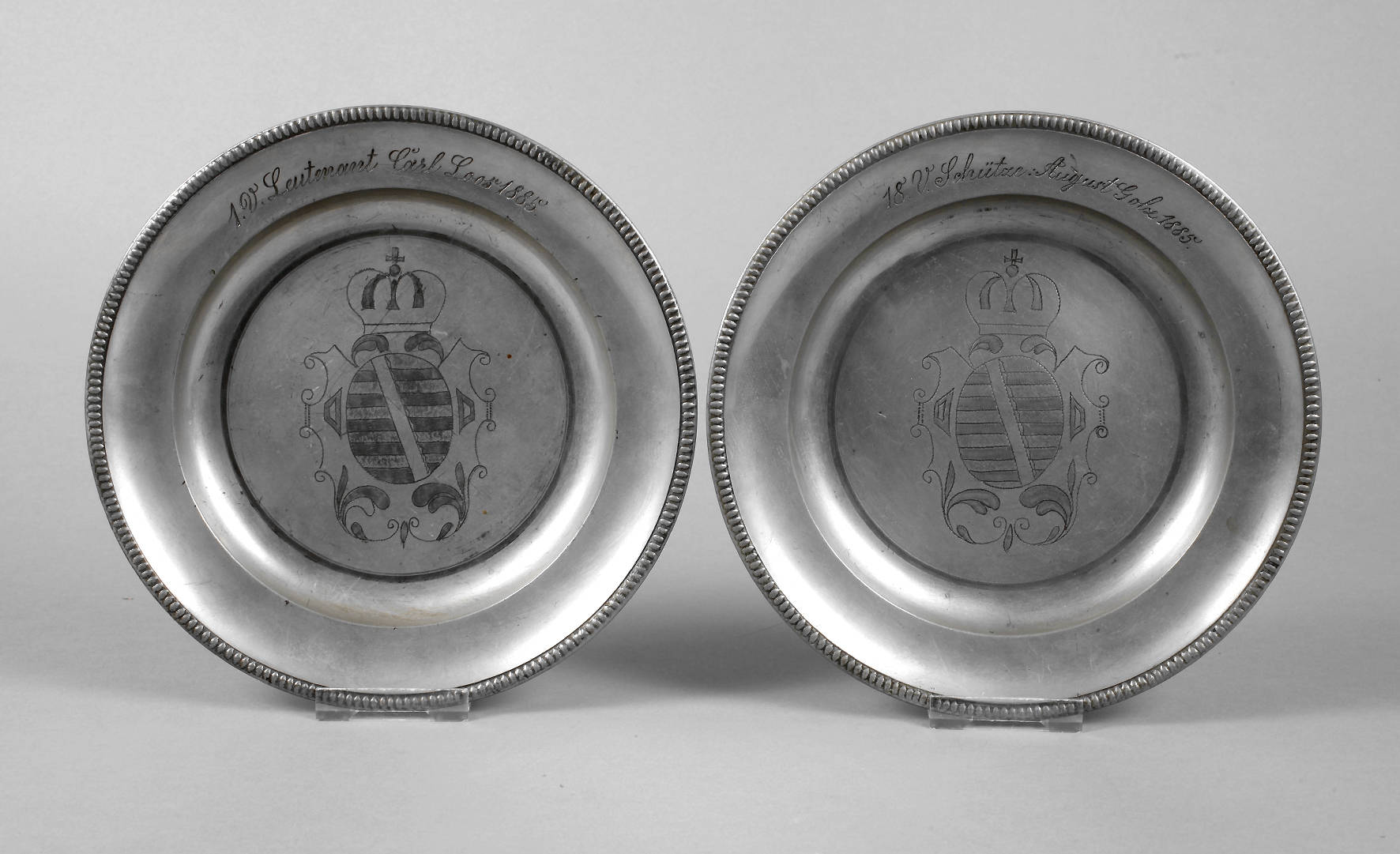 Zinnstempel C. Reichel Annaberg, im Spiegel graviertes Sachsenwappen, auf den Fahnen: 1. V. Leutnant Carl Loos und 18. V. Schütze August Golst, Gebrauchsspuren, D 22 cm.