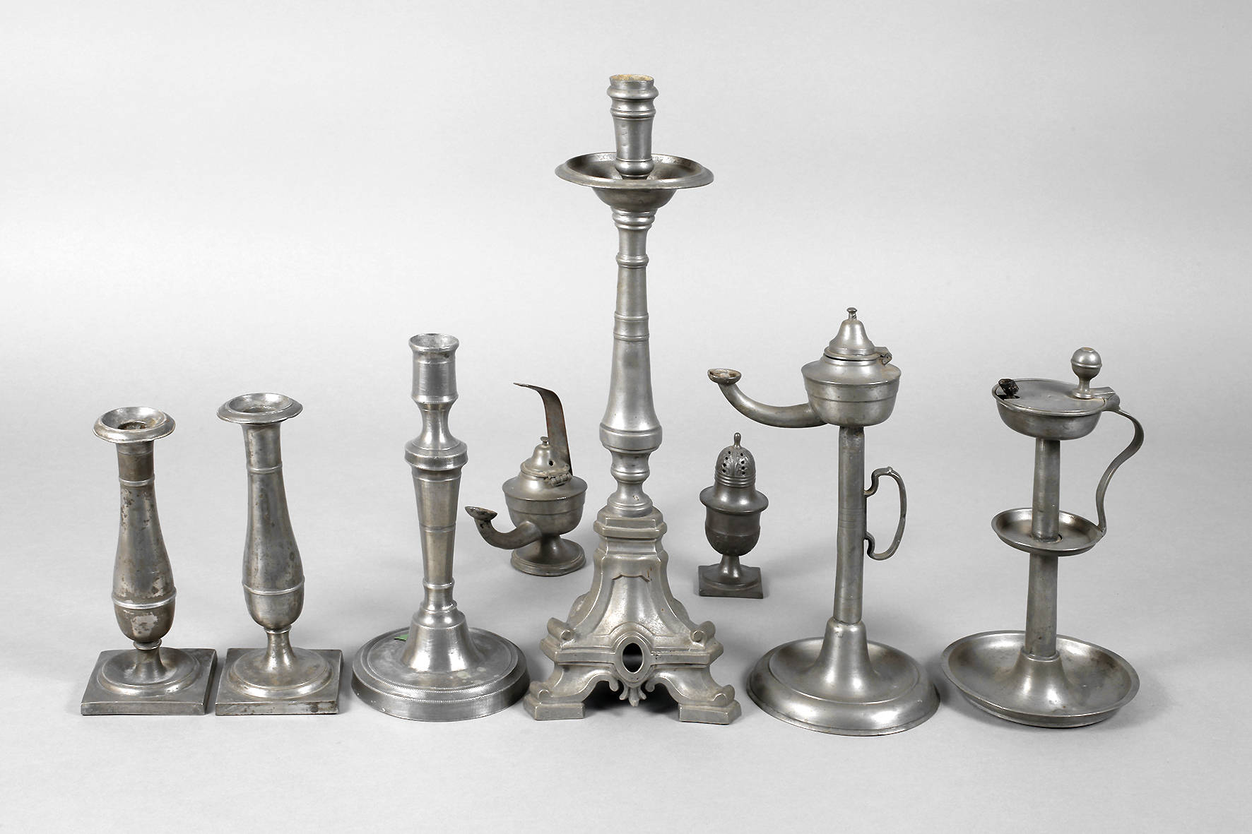 19. Jh., drei Öllampen, vier Leuchter und ein Salzstreuer, verschiedene Erhaltungen, H 44 cm.