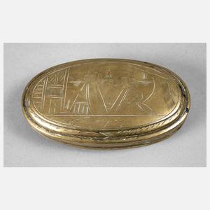18. Jh., Messing beidseitig figürlich graviert, Szenen in Landschaft mit Reim Oneman fraey Weg oude pney?, innen mit braunem Samt ausgekleidet, Deckel scharniert, Gebrauchsspuren, L 11 cm.