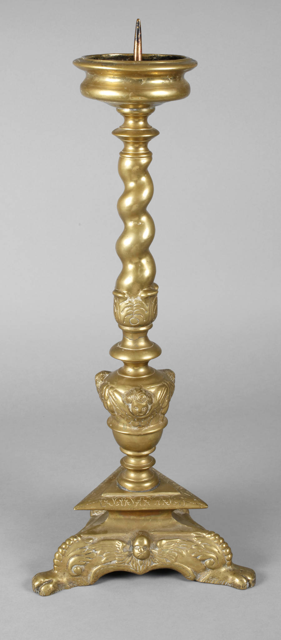 19. Jh., Bronze gegossen und graviert, auf Tatzenfüßen, verziert mit Engelsgesichtern und Palmetten, der Schaft gedreht gerippt, tiefe Tropfschale mit hohem Dorn, mittig repariert, Gebrauchsspuren, H 70 cm.