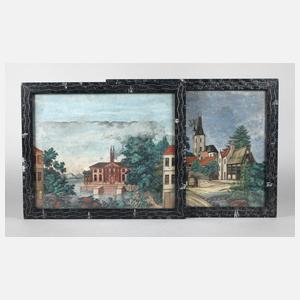 dabei Schloss am See vor Gebirgskulisse, und sommerlicher Dorfplatz mit Kirche, Mischtechniken (Collage aus silhouettierten Lithos, teils mit Stoff hinterlegt, koloriert bzw. mit Tusche ergänzt), unsigniert, Altersspuren, als Pendants hinter Glas gerahmt, Falzmaß ca. 35 x 41 cm bzw. 35,5 x 43,5 cm.