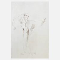 leicht bekleidete Dame beim Tanz, sparsame angelegte Lithografie, um 1970, links unten nummeriert und handsigniert signiert „27/200 Regis Dho“, unter Passepartout, hinter Glas in Bilderträger gerahmt, Passepartoutausschnitt ca. 37,5 x 46 cm. Künstlerinfo: frz. Designer und Grafiker (1948 geboren in Rabbat), 1970 tätig für Pierre Gardin, entwarf ca. 80 Innenraumgestaltungen für verschiedene Hotels, Zusammenarbeit mit den Architekten Frank Gehry, Entwerfer für verschiedene Nobelmarken, Quelle: Internet.