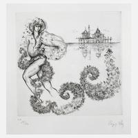 umherschwebende Fabelwesen, Radierung, um 1970, rechts unten signiert „Regis Dho“, links unten nummeriert „17/100“, unter Passepartout, hinter Glas gerahmt, Plattenmaß 36 x 27 cm. Künstlerinfo: frz. Designer und Grafiker (1948 geboren in Rabbat), 1970 tätig für Pierre Gardin, entwarf ca. 80 Innenraumgestaltungen für verschiedene Hotels, Zusammenarbeit mit den Architekten Frank Gehry, Entwerfer für verschiedene Nobelmarken, Quelle: Internet.
