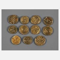 11 Stück, sog. Fanam, meist 18. Jh., Südindien / Ceylon, sog., dabei Mysore und Malabar, D von 5 und 8 mm, G je von 0,3 bis 0,4 g, sehr gute Erhaltung.