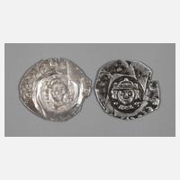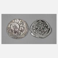 Bistum Trier, Brustbildnis Bischof mit Mitra, Omophorion, erhobener Hand und Krummstab, Rv. gekreuzte Schlüssel im Schild, G ca. 0,89 g, fvz., Bistum Bamberg, um 1200, achtblättrige Blüte, G ca. 0,75 g, ss.