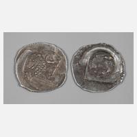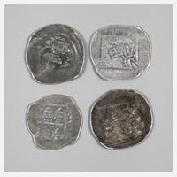 Brakteat mit Haupt eines Herrsches von vorn, G 0,82 g, ss+, sowie drei Händleinheller der Stadt Hall, erhobene, offene Hand, Rv. Kreuz mit gegabelten Enden und Punkt, G je ca. 0,45 g, 1 x vz., 2 x ss.