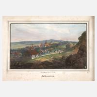 Blick auf Falkenstein im Vogtland von einer Anhöhe aus, mittig ist die Alte Stadtkirche zu sehen, kolorierte Lithografie, um 1850, unten mittig bezeichnet „Nach der Natur gez. u. lith. von C. W. Arldt.“ und betitelt „Falkenstein.“, Erhaltungsmängel, unter Glas gerahmt, Falzmaß ca. 18,5 x 26 cm. Künstlerinfo: dt. Zeichner und Lithograf (1809 Niederruppersdorf bis 1866 Löbtau), 1826-30 Studium an der Kunstakademie in Dresden bei Carl August Richter, nachfolgend Lehre als Lithograph, Quellen Wikipedia, Internet.