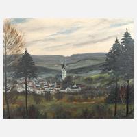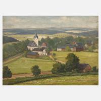Ansicht des Ortes von einer Anhöhe aus mit Kirche, vor dem Bau der Talsperre Pöhl, Öl auf Pappe, Mitte 20. Jh., rechts unten monogrammiert „JH“ (ligiert), Malträger gewellt und reinigungsbedürftig, gerahmt, Falzmaß ca. 31 x 41 cm. Künstlerinfo: auch Hans Hegner, dt. Maler, Graphiker und Restaurator (1924 Plauen /Vogtland bis 1979 Plauen), zunächst Lehre als Dekorationsmaler, studierte 1951-55 bei Erich Fraaß, Rudolf Bergander und Hans Grundig an der Akademie der bildenden Künste Dresden, ab 1953 Mitglied im Verband Bildender Künstler (VBK) der DDR, unternahm Studienreisen nach Bulgarien, Polen und der Sowjetunion, freischaffend tätig in Plauen, Quelle: Vollmer, Frank Weiß ”Malerei im Vogtland” und Eisold „Künstler in der DDR“.
