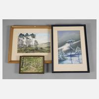 dabei abendliche Winterlandschaft, Pastell, Herbstlandschaft mit Kiefern, Mischtechnik (Aquarell und Gouache) sowie Bachlauf im sommerlichen Laubwald, Aquarell, ein mal signiert ”Barthell” und zwei mal monogrammiert ”AB”, unterschiedliche Formate und Erhaltungszustände, je hinter Glas gerahmt, Passepartoutausschnitt max. 23 x 15 cm. Künstlerinfo: dt. Maler und Graphiker, erwähnt 1925-33 in Plauen, Quelle: persönliche Dokumente und Adreßbuch der Kreisstadt Plauen im Vogtland 1925.