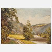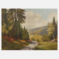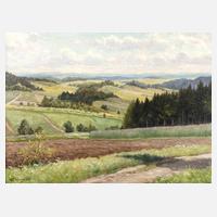 Blick in ein sonniges von Wiesen bedecktes Tal, an den Hängen erstrecken sich weite Wälder, pastose Malerei, Öl auf Leinwand, Mitte 20. Jh., rechts unten signiert „F. Schick“, gering restaurierungsbedürftig, in ca. 12 cm breiten goldbronzierten Stuckrahmen, Falzmaß ca. 61 x 81 cm.