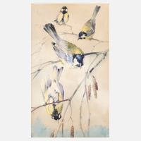 Vier Meißen auf kahlen Ästen sitzend, Aquarell, in der Darstellung rechts unten monogrammiert und datiert „KG (19)40“, auf Passepartout links unten betitelt „Eine lustige Gesellschaft“, rechts unten signiert und bezeichnet „Kurt Geipel - Netzschkau“, gegilbt, hinter Glas in Passepartout gerahmt, Passepartoutausschnitt ca. 24 x 15 cm. Künstlerinfo: dt. Maler, Graphiker und Entwerfer (1902 Netzschkau bis 1944 bei Montélimar), studierte 1917-21 an der Kunstschule Plauen, anschließend kurzzeitig als Entwerfer in Berlin, schuf Illustrationen für die ”Leipziger Illustrierte” und ”Westermanns Monatshefte”, gefördert von Hermine Reuß ältere Linie (1887-1947) der letzten Frau Kaiser Wilhelm II., 1929 große Studienreise in den Orient, ab 1933 Lehrer an der Kunstschule Plauen, beschickte 1941-44 die Große Deutsche Kunstausstellung im Haus der Deutschen Kunst München, Mitglied der Künstlervereinigungen ”Akanthus” und ”Burgsteiner” hier genannt ”Schuss”, tätig in Netzschkau und Plauen, Quelle: Vollmer, Dressler, Archivunterlagen der ”Burgsteiner”, Frank Weiß ”Malerei im Vogtland” und Internet.