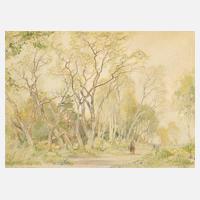 Waldweg im Frühlingsgrün mit Spaziergängern, Farbstifte, unterhalb der Darstellung links datiert und betitelt „24.5.(19)42 Pfingsten”, rechts monogrammiert und nochmals datiert „KG (19)42”, rückseitig Aufkleber „Kunsthandlung Fritz Geyer, Plauen...”, leichte Erhaltungsmängel, unter Passepartout hinter Glas gerahmt, Passepartoutausschnitt ca. 19,5 x 26,5 cm. Künstlerinfo: dt. Maler, Graphiker und Entwerfer (1902 Netzschkau bis 1944 bei Montélimar), studierte 1917-21 an der Kunstschule Plauen, anschließend kurzzeitig als Entwerfer in Berlin, schuf Illustrationen für die ”Leipziger Illustrierte” und ”Westermanns Monatshefte”, gefördert von Hermine Reuß ältere Linie (1887-1947) der letzten Frau Kaiser Wilhelm II., 1929 große Studienreise in den Orient, ab 1933 Lehrer an der Kunstschule Plauen, beschickte 1941-44 die Große Deutsche Kunstausstellung im Haus der Deutschen Kunst München, Mitglied der Künstlervereinigungen ”Akanthus” und ”Burgsteiner” hier genannt ”Schuss”, tätig in Netzschkau und Plauen, Quelle: Vollmer, Dressler, Archivunterlagen der ”Burgsteiner”, Frank Weiß ”Malerei im Vogtland” und Internet.