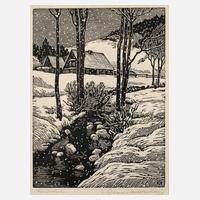 idyllischer Blick auf einen von Bäumen gesäumten Bachlauf mit Gehöft, schneebedeckte Landschaftspartie im Vogtland, Holzschnitt, um 1920, im Stock monogrammiert „GR“, weiterhin unter der Darstellung in Blei bezeichnet „Handdruck“und handsigniert „R. Grimm-Sachsenberg.“, etwas gegilbt, gerahmt, Falzmaß ca. 30 x 24 cm. Künstlerinfo: eigentlich Richard Grimm, dt. Maler, Graphiker, Buch- und Schriftkünstler (1873 Untersachsenberg /Vogtland bis 1952 Leipzig), studierte 1892-93 an der Akademie Dresden, 1893-94 an der Privatmalschule Holoszy und 1894-98 an der Akademie in München bei Karl Raupp, sowie Malschüler bei Anton Azbè, schuf Beiträge für die Münchner Zeitschriften „Fliegende Blätter“, „Jugend“, „Simplicissimus“ und „Pan“, 1898 Lithographenlehre in Leipzig, anschließens in Berlin, Dresden und München tätig, 1900 Italienreise, 1902-04 auf Vorschlag von Peter Behrens Lehrer an der Kunstschule Krefeld, 1905 Meisterschüler bei Ludwig von Hofmann und Rückkehr nach Leipzig, verwendet nun den Künstlername „Grimm-Sachsenberg“ als Bekenntnis zu seinem Geburtsort, fortan für die Bugra und als freier Künstler in Leipzig tätig, vertreten in den Kupferstichkabinetten Dresden, München und Leipzig und im Vogtlandmuseum Plauen, Mitglied im Reichsverband Bildender Künstler Deutschlands, im Leipziger Künstlerbund und Verein Deutscher Buchgewerbekünstler Leipzig, Quelle: Thieme-Becker, Vollmer, Dressler, Goldstein, Matrikel der Münchner Akademie, Internet und Frank Weiß ”Malerei im Vogtland”.