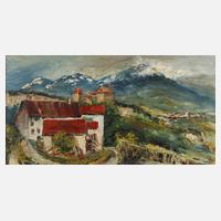 Blick in sonnige Gebirgslandschaft vorbei an Häusern und der Stammburg der Grafen von Tirol zur impossanten alpinen Bergsilhouette hoch über der ehemaligen südtiroler Landeshauptstadt Meran, expressive, pastose malerei mit breitem Pinselduktus partiell in Spachteltechnik, Öl auf Leinwand um 1980, rückseitig auf der Leinwand signiert und betitelt ”Martin Grünert Hof /Lindenstr. 22 - Schloß + Dorf Tirol bei Meran Italien”, gerahmt, Falzmaß ca. 45 x 80,5 cm. Künstlerinfo: genannt „Maler vom Vertl“, dt. Landschafts-, Blumen- und Vedutenmaler (1909 Hof bis 1993 Hof), 1924-27 Lehre zum Musterzeichner, studierte 1928-31 an der staatlichen Kunstschule Plauen, anschließend als Textilentwerfer unter anderem in Berlin tätig, 1938-78 als Musterzeichner, Lehrausbilder und Leiter des Musterbüros bei Lorenz Summa & Söhne in Oberkotzau, 1940-50 Kriegsdienst und -Gefangenschaft, 1965 Fernstudium und Diplom der Ecole de Paris, unternahm Studienreisen durch Europa und den Iran, Mitglied der Künstlergruppe Nordfranken, 1989 Ehrung mit der „Johann-Christian-Reinhart-Plakette“ der Stadt Hof, Quelle: Kulturamt der Stadt Hof und Internet.