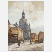 Blick aus Richtung Jüdenhof vorbei am Johanneum auf den Neumarkt und die Frauenkirche in Dresden, gekonnt erfasste, impressionistische Vedutenmalerei, Mischtechnik (Aquarell und Gouache über Bleistift) um 1920, links unten in Blei signiert ”Rud. Poeschmann Dresden”, hinter Glas und Passepartout im Stuckrahmen gerahmt, Passepartoutausschnitt 58 x 44,5 cm. Künstlerinfo: eigentlich Karl Julius Rudolf Poeschmann, dt. Genremaler (1878 Plauen /Vogtland bis 1954 Dresden), studierte ab 1896 an der Akademie München, hier Schüler von Johann Caspar Herterich, später bei Carl Bantzer und Gotthard Kuehl an der Akademie Dresden, Mitglied im Reichsverband Bildender Künstler Deutschlands, der Dresdener Künstlervereinigung und der Allgemeinen Deutschen Kunstgenossenschaft, tätig in Dresden, Quelle: Thieme-Becker, Vollmer, Dressler, Matrikel der Münchner Akademie und Frank Weiß ”Malerei im Vogtland”.