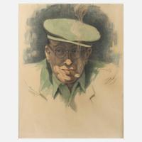 Kopfbildnis eines älteren Herrn im grünem Hemd, grüner Schiebermütze und Nickelbrille verschmitzt eine Zigarre rauchend, Mischtechnik (Bleistift und Aquarell), rechts signiert und datiert ”Schilling-Rest (19)51”, gering geblichen und gegilbt, Provinienz: Nachlass Schilling-Rest, hinter Glas gerahmt, Falzmaß 53 x 42 cm. Künstlerinfo: geboren als Enno Schilling, Künstlername ”Schilling-Rest”, dt. Maler, Zeichner und Graphiker (1891 Plauen bis 1976 Plauen), um 1910 Schüler der Kunstschule Plauen bei Prof. Richard Schauer, tätig als Entwerfer für die Plauener Spitzenindustrie, Mitglied der Künstlervereinigungen ”Burgsteiner” und ”Akanthus”, tätig in Plauen, Quelle: Info der Familie, Archivunterlagen der Burgsteiner sowie Adressbuch der Stadt Plauen 1925 und 1950.