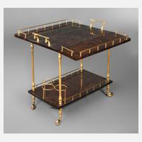 1960/70er Jahre, Ausführung Tura Milano, Platten bespannt mit lackiertem Ziegenleder, goldene Messingmontierung, Wagen mit seitlich ausklappbaren Abstellflächen, die untere Ebene mit Flaschehalter, guter Zustand mit geringen Gebrauchsspuren, H 76 cm x B 75 cm x T 41 cm.