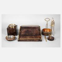 1970er Jahre, origianal Klebeetikett TURA Made in Italy, Metall vergoldet, mit Ziegenleder bezogen und lackiert, fünfteilig bestehend aus Tablett, Eisbehälter, Aschenbecher, einer gemuldeten Schale mit Tragegriff und Besteckhalterung, Gebrauchsspuren, eine Zange ergänzt, Tablett 35x35 cm.