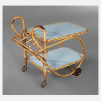 1950er Jahre, Gestell aus Bambusrohr, Platten aus hellblauem Spelakart, guter Originalzustand mit Altersspuren, Maße 72 x 80 x 44 cm.