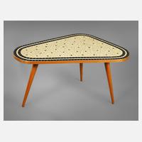 deutsch, 1950er Jahre, kleiner Nierentisch mit schwarz gelben Fliesenmosaik, Gestell aus Buche, Maße 55 x 93 x 65 cm.