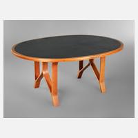 Chile um 1970, großer ovaler Tisch aus Schichtholz, Platte mit schwarzem Leder bespannt, verschraubtes Gestell mit y-förmigen Beinen, guter Originalzustand, H 70 cm x B 156 cm x T 120 cm. Quelle: Website Valdés Muebles Laminados.