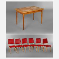 ungemarkt, DDR Fabrikation, rechteckiger Auszugtisch in Eiche furniert, dazu sechs Stühle aus massiver Buche mit originalem roten Kunstlederbezug, teils stärkere Alters- und Gebrauchsspuren, rest. bed., Maße Tisch 76 x 110 x 65 cm, L max. 180 cm.