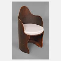 Entwurf und Ausführung Boris Broschardt 2008, für die Ausstattung des ”Salon der Freiheit” im Kabarett Niedermair in Wien, Schichtholz, gebeizt, geschnitten und über Dampf gebogen, Polsterauflagen, Stoffbezug, leichte Gebrauchsspuren, H 88, D 55 cm. Der Entwurf war eine Auftragsarbeit von Nadja Niedermair für den ”Salon der Freiheit”, einem Club über den Räumlichkeiten des Kabarett Niedermair und wurde nur dort verwendet. Insgesamt bestand die Ausstattung aus sechs Sitzbänken, acht Tischen und 19 Sesseln. Provenienz: Kabarett Niedermair, 1080 Wien, Lenaugasse 1, bis 2014.