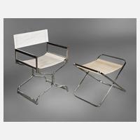 ungemarkt, 1970er Jahre, Stahlrohr verchromt, Bespannung aus weißem Kunstleder, Bespannung der Ottomane vergilbt und craqueliert, Stuhl in gutem Zustand, H 79 cm x B 45 cm x T 52 cm.