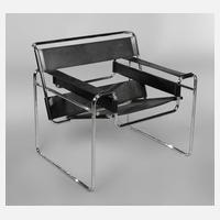 Entwurf 1925, Ausführung Knoll International, 1990er Jahre, mit gravierter Marke und Signatur ”Marcel Breuer” sowie Klebeetikett Knoll Studio E 98B, Stahlrohr verchromt, mehrteilig verschraubt, schwarzes Lederpolster, sehr guter Zustand, 74x79x65 cm.