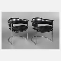 Ausführung Mario Sabot, Italien 1970er Jahre, verchromtes Gestell ais Flachstahl, bequemer Freischwinger mit umlaufender gepolstereter Lehne, originaler schwarzer Kunstlederbezug, guter Originalzustand, Maße 68 x 63 x 53 cm.