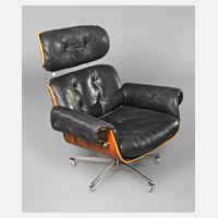 ungemarkt, Ausführung 1970er Jahre, nach einem Entwurf von Charles und Ray Eames, Gestell aus gebogenem Schichtholz, mit originalem schwarzen Lederbezug, auf verchromtem Drehgestell, Alters- und Gebrauchsspuren, ein Lederknopf fehlt, Maße 95 x 90 x 80 cm.