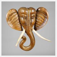 1. H. 20. Jh., Holz geschnitzt und bräunlich gefasst, dreiteilig gefertigtes Elefantenhaupt mit eingesteckten Stoßzähnen aus Bein, eine best., H ca. 50 cm.