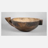 20. Jh., helles Tropenholz, halbrund geschnitzt, mit Griffstück, teilweise gefärbt und mit Kerbschnitzerei verziert, Altersspuren und kleine Substanzverluste, D ca. 31 cm.