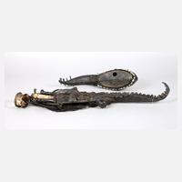 Prunk-Waffengehänge, 1. H. 19. Jh., komplett schwarz gefasst, die Scheide aus einem präpariertem Krokodil gefertigt, der Kopf des Tieres zur Zier aufgenäht, daran Gehänge aus Leder mit Zierquasten und verziertem Beinring, drei eingesteckte maurische Dolchgriffe, Dekorationsstück, L ca. 80 cm, dazu Musikinstrument, 1. 20. Jh., der Körper aus Leder mit Pergamentbespannung, eingefasst mit Kaurischnecken, Hals aus einem Kuhhorn gefertigt mit vier eingesteckten Wirbeln, L ca. 47 cm.