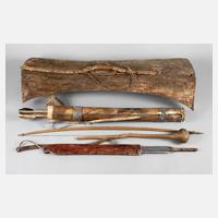 Ostafrika 1. Hälfte 20. Jh., acht Teile, bestehend aus Schild aus starkem Leder mit Trageschlaufe und eingeflochtenem Griff, L 88 cm, kleinem Bogen mit drei Pfeilen und lederbezogenem Holzköcher, L Pfeile 65 cm, handgeschmiedetem Schwert mit umwickeltem Griff und in Lederscheide, L 57 cm, sowie kleiner Kugelkeule, L 51 cm, Altersspuren, gute Erhaltung.