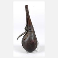 18. Jh., birnenförmiger Holzkorpus mit geprägter Lederummantelung, gravierte Kupfermontierung, mit Füllstutzen, Dosiervorrichtung und Halterungsring, Z 2, L 22 cm.